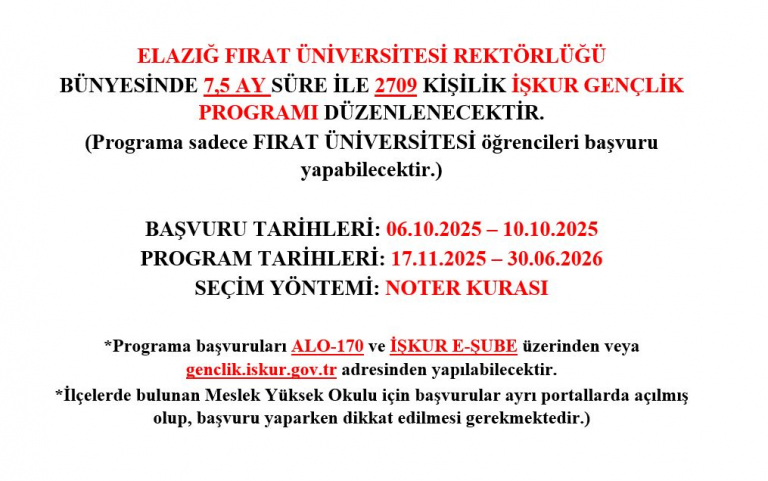 FIRAT ÜNİVERSİTESİ REKTÖRLÜĞÜ BÜNYESİNDE 7,5 AY SÜRE İLE 2709 ÖĞRENCİYE İŞKUR GENÇLİK PROGRAMI DÜZENLENECEKTİR.