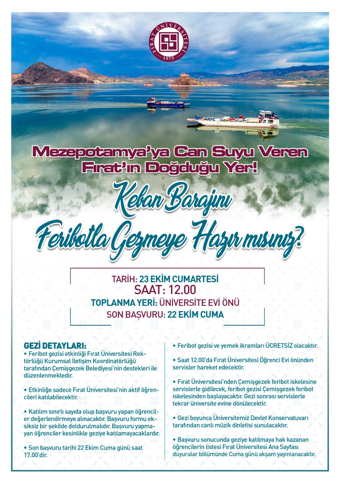 Üniversitemiz Kurumsal İletişim Koordinatörlüğü tarafından öğrencilerimizin motivasyonlarını artırmak ve Elazığ’ın turistik değerlerini tanıtmak amacıyla 23 Ekim Cumartesi günü ücretsiz Keban Baraj Gölü Feribot Gezisi etkinliği düzenlenecektir.