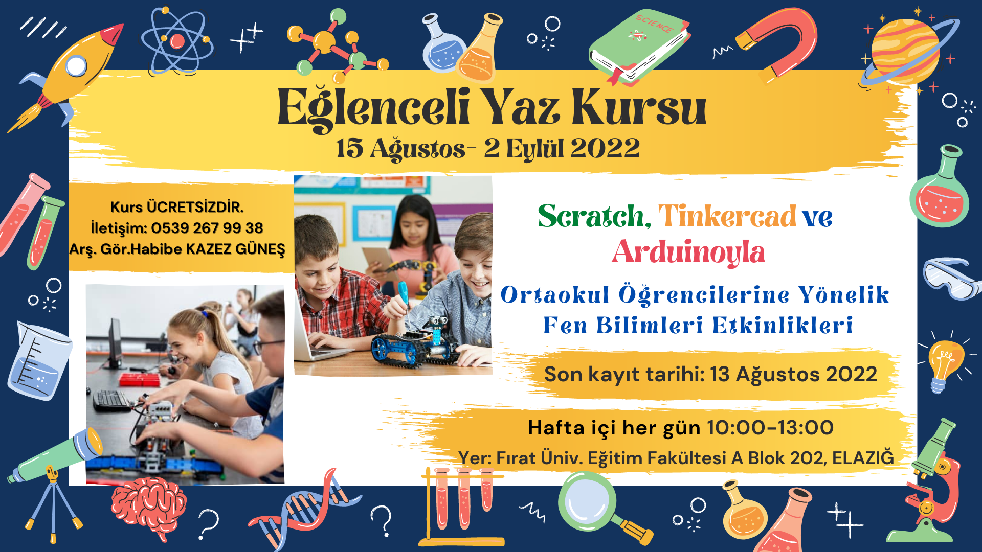 Üniversitemiz Eğitim Fakültesi Bilgisayar ve Öğretim Teknolojileri Eğitimi Bölümü Bilgisayar ve Öğretim Teknolojileri Eğitimi Anabilim Dalı Arş. Gör. Habibe GÜNEŞ'in, Fakülte bünyesinde Üniversitemizin akademik ve idari personellerinin bu yıl ortaokul 5., 6., veya 7. sınıfı bitirmiş olan öğrencileri için 15 Ağustos- 2 Eylül 2022 tarihleri arasında bir yaz kursu etkinliği planlanmıştır.
