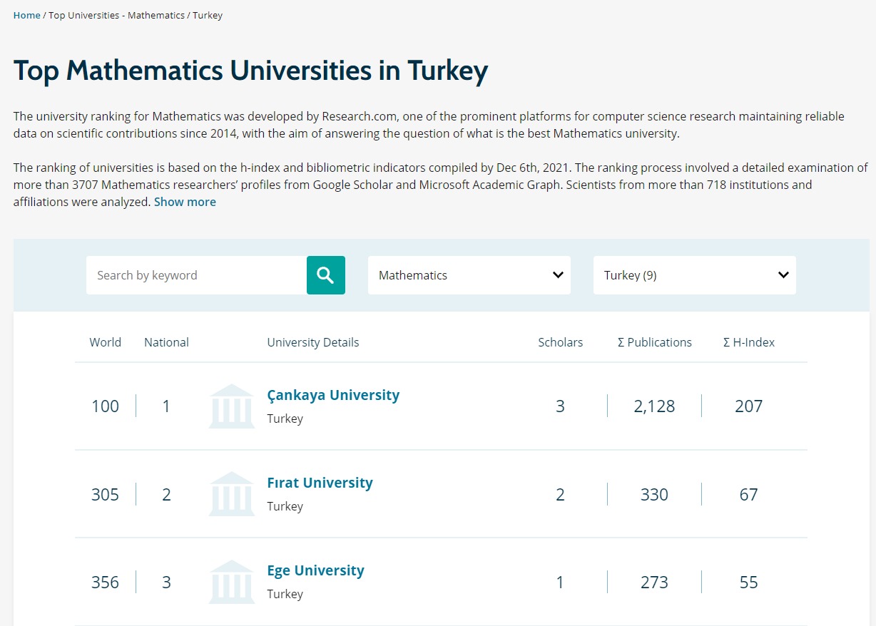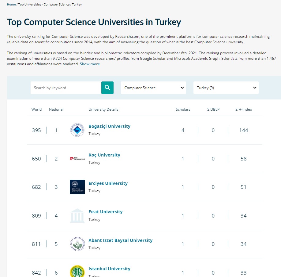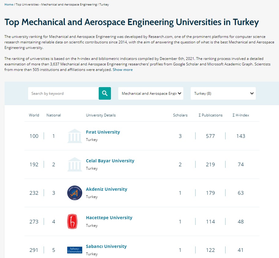 Alan bazlı olarak “research.com” internet sitesi tarafından h-indeks ve bibliyometrik göstergeler dikkate alınarak belirlenen üniversitelerin dünya sıralamaları açıklandı.
