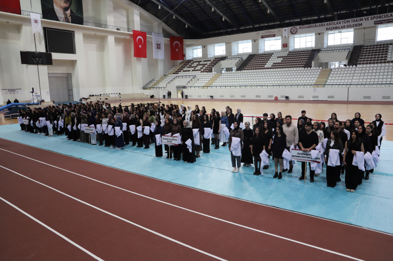 Üniversitemiz Çok Amaçlı Spor Salonunda düzenlenen törene; Rektör Yardımcısı Prof. Dr. İrfan Kaygusuz, Sağlık Bilimleri Fakültesi Dekanı Prof. Dr. Gamze Kırkıl, akademisyenler, öğrenciler ve aileleri katıldı. Sağlık alanında eğitim gören öğrencilerin meslek hayatına geçişini temsil eden beyaz önlükler, tören kapsamında büyük bir gurur ve heyecan eşliğinde giydirildi.