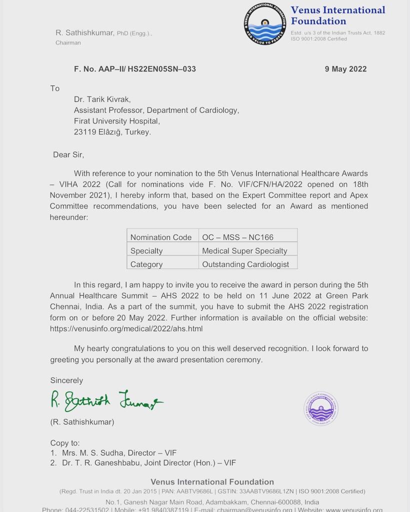 Tıp Fakültesi Kardiyoloji Anabilim Dalı Öğretim Üyesi Doç. Dr. Tarık KIVRAK ödülünü Green Park Chennai Hindistan’da Annual Healthcare Summit 2022 toplantısında alacak.