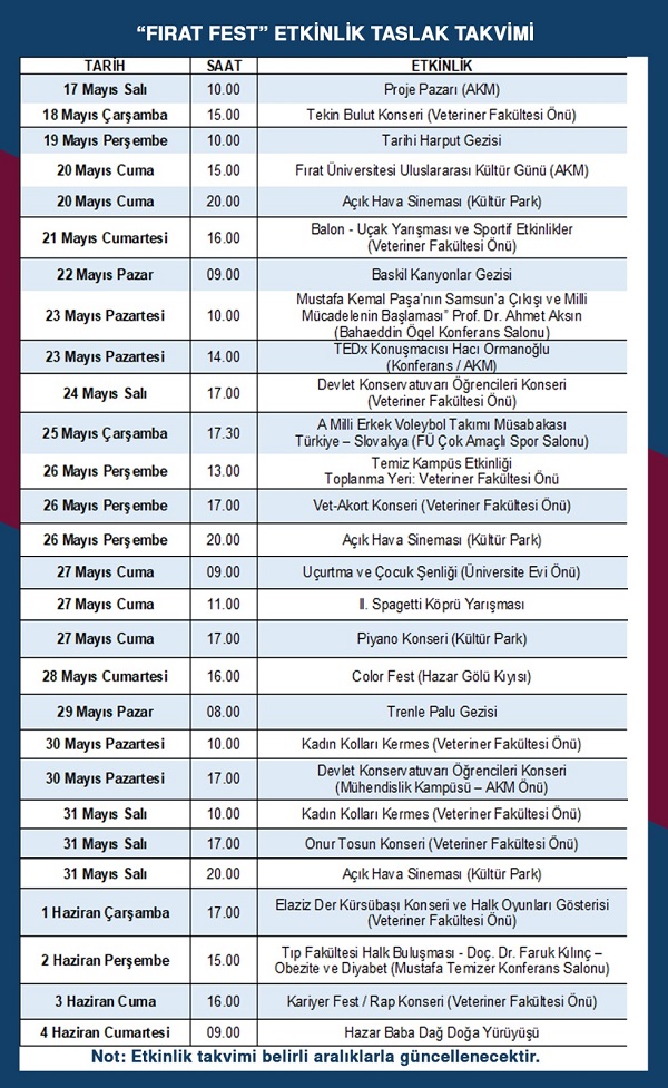 Yaklaşık 20 gün boyunca sürecek olan ‘FIRAT FEST’ kapsamında; tarihi ve turistik geziler, colorfest, konserler, açık hava sineması, gösteriler, söyleşiler, konferanslar ve yarışmalar yapılacaktır. 17 Mayıs tarihi itibariyle başlayacak olan ‘FIRAT FEST’ kapsamında öğrencilerimiz 4 Haziran tarihine kadar çeşitli etkinliklerle buluşacaktır.