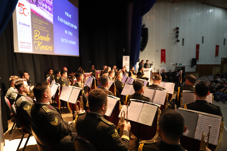 Üniversitemizin kuruluşunun 50. yıl dönümü etkinlikleri kapsamında, Malatya 2. Ordu Bölge Bando Komutanlığı ile Üniversitemiz Devlet Konservatuvarı iş birliğinde düzenlenen ortak konser, unutulmaz bir müzik ziyafeti sundu.