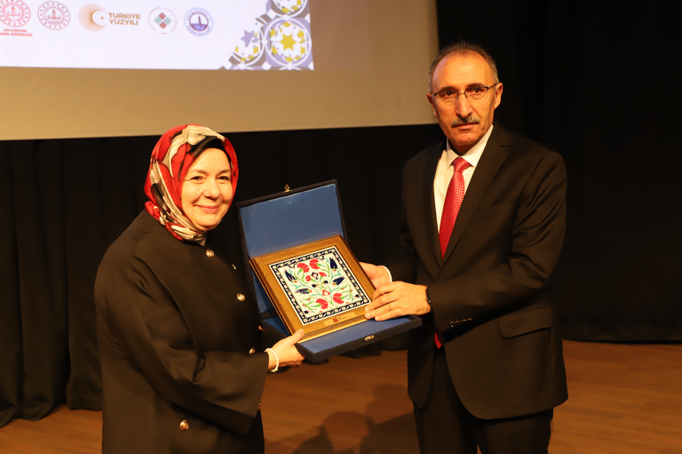 Konuşmaların ardından, Elazığ Valisi Numan Hatipoğlu ve Üniversitemiz Rektörü Prof. Dr. Fahrettin Göktaş, çalıştaya katılan Milli Eğitim Bakan Yardımcısı Doç. Dr. Celile Ökten’e günün anısına hediye takdim etti.